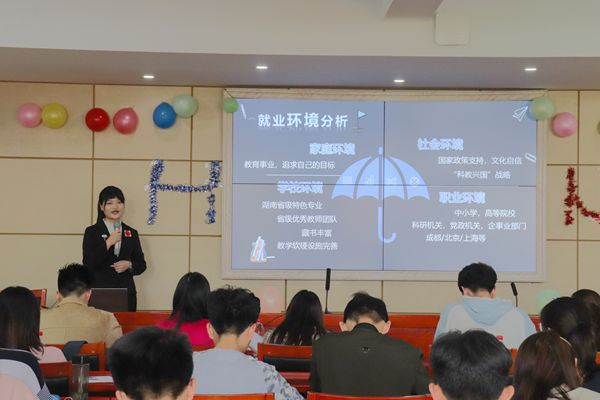 比赛开始,主持人姜宝权和杨文月对在场观众表示欢迎,并向观众介绍了本次比赛的评委,同时对比赛规则做了详细的解说。接着,由团委学生会主席林点作为评委代表上台发言,他简要地说了一下本次大赛的目的和宗旨,劝勉大一学生说:“要全面地看待各个职业,培养正确的择业观和就业观。”最后,他对进入决赛的同学表示了鼓励和期待。决赛分两个环节,第一个环节由选手在五分钟内对职业生涯规划进行解说。这9位选手在热烈的掌声中一次走上台,他们大多数对自己的职业期望是成为教师,但也有像成为明星经纪人等新颖的职业理想。根据自己的职业理想,他们找出自身的优缺点,并向着这一理想而规划或短或长的目标。为了应对未知的条件,他们还规划了职业备选方案。第二个环节由评委对选手进行提问,时间限制在两分钟内。在这个互动过程中,评委可以更加了解选手,更细致地观察选手,为评分得到更好的依据。此次比赛中,选手们着装正式,精神面貌俱佳,在台上展示制作精美的幻灯片,精彩地解说他们的职业规划。他们饱含激情,眼睛里散发着对未来职业的憧憬,面对观众气场坚定、侃侃而谈,获得了在场观众的一致点赞。