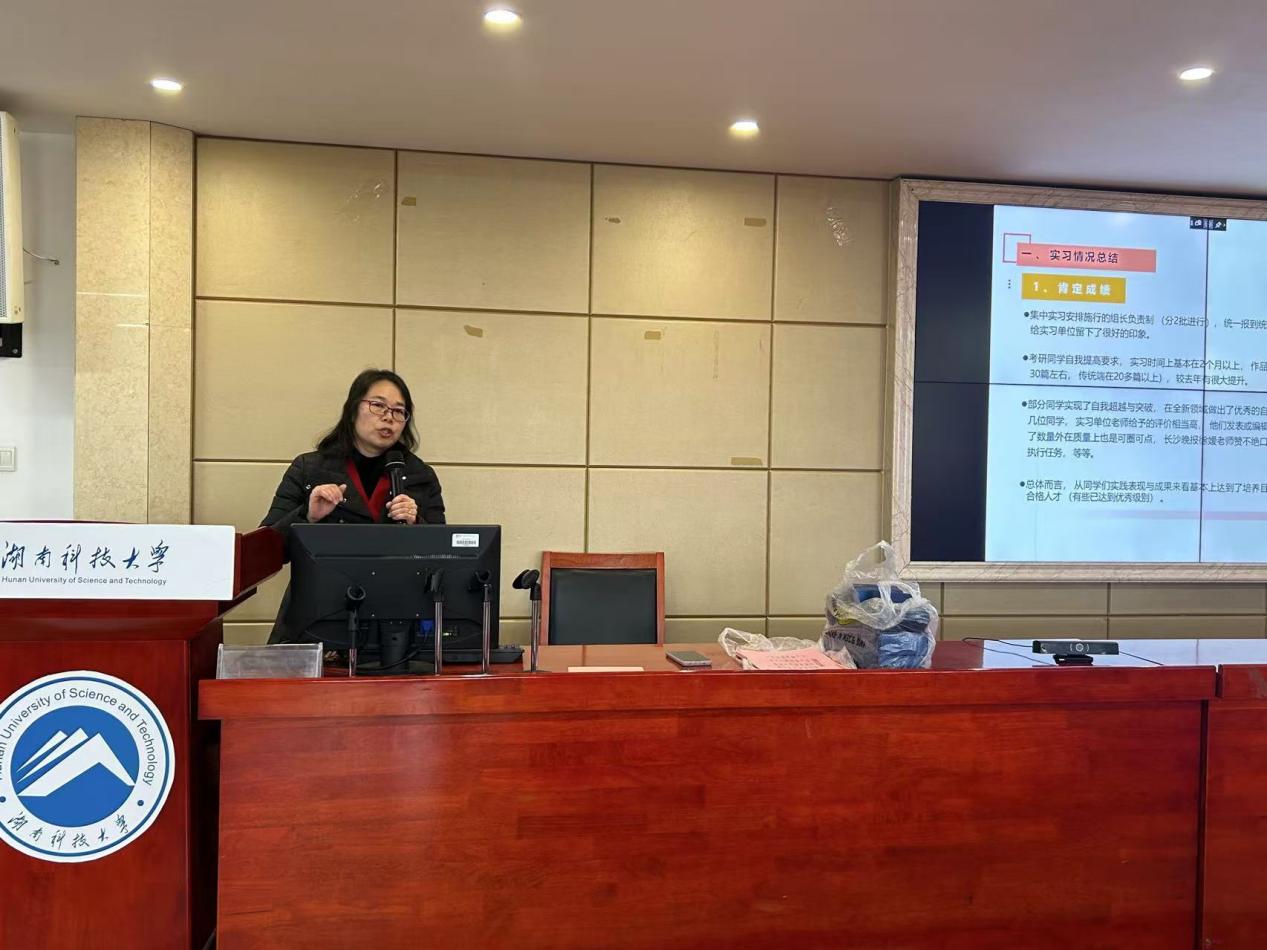 会上,刘艳凤首先对21级学生的实习情况进行了全面总结。她高度赞扬了同学们在实习中的优秀表现,“部分同学实现了自我超越与突破,如长沙晚报、星辰在线的丁子鸣、王志鹏同学,实习单位老师给予了很高评价。”同时她也坦诚地指出了同学们在实习过程中存在的一些不足,指出少数学生“写作与沟通等基本功能不强”“一些细节没有注意”“创新性与深度高质量产品少”等。刘艳凤表示,总体来看,本届学生的实习情况值得肯定,他们通过实习在专业技能与综合素质甚至在一些全新领域里得到了很好地锻炼,为就业打下坚实的基础。