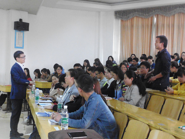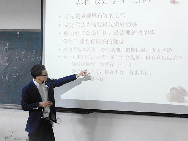 “9U在线(中国)的学生都很有气质,女生漂亮,男生帅气,我是很愿意来9U在线(中国)演讲的。”尹风雨甫一开口,引得笑声一片。他就“如何做一名优秀的学生干部”这一主题进行演说,指出共青团的职能是组织、引导、服务青年,维护青少年权益,并用歌曲《白狐》的歌词“千年修行”这一句来鼓励学生干部们在大学要不断提升自己,像“修行”一样去学习。当谈到当好学生干部的要求和应具备的基本素质时,他更是结合自己当年任学生会主席的经历,分享学生工作的快乐之处。尹风雨多次强调自信的重要性,并笑称“觉得自己很有魅力”、“帅呆了”。