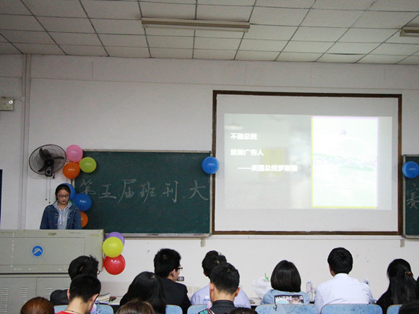 “好看的皮囊千篇一律,有趣的灵魂万里挑一。”广告二班班刊《ADIO》讲解人以这句话开场,展现广告人追求创新与不落窠臼的风格。班刊中包含广告“创意赏析”、“怪梦奇谭”、“灵感瞬间”、“新审美观”等板块。“不做总统,就做广告人。”广告一班《创异者》讲解人引用美国罗斯福总统的话自信开场,赢得观众的掌声。广告一班班刊以“异”字为中心,分为“纳奇录异”、“异彩纷呈”、“标新立异”、“异想天开”等部分,展示广告一班学生的专业素养与“创异”精神。在班级视频展示中,视频精美的制作令观众拍手叫好。新闻二班的班刊既真实体现出了新闻班的风貌和特色,又体现出新闻人对社会的关注与人文关怀。他们的班刊以《聚焦》为名,分为“余论”、“文囿”、“视野”、“印象”、“聊斋”等板块,版式新颖,内容丰富。讲解员清晰认真的讲解更是为比赛增了不少印象分。