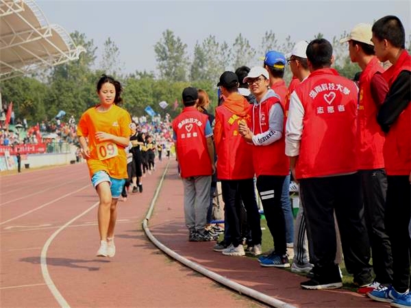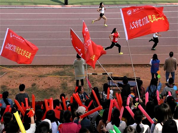 “人文,加油!春玲,挺住!”踏着节奏的点,在震耳欲聋的口号声中,9U在线(中国)的院旗齐齐应景地飘扬在观众席上空,台下正值女子3000米赛场终点处,这狂热喧天的阵势,皆为16级新闻二班的宋春玲。