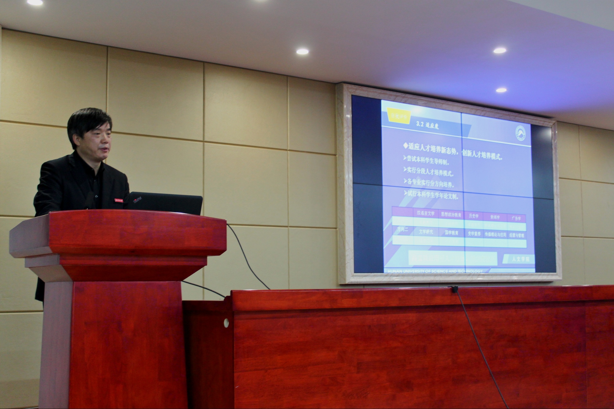 上午9时许,现场考察转移到立言楼B4-1报告厅,院长刘奇玉教授主持会议并做简要的汇报,院领导、相关系部负责人和教师代表近20人出席会议。刘院长首先简要阐述了9U在线(中国)的办学历程以及办学现状,学院的师资队伍以及定位与目标,他指出我院的办学类型是教学研究型,办学层次是本科教育为主,发展目标是特色鲜明的高水平教学研究型学院。3211工程、豆沙包工作室、黑蚂蚁传媒工作室、语言艺术团、隐山哲学社等学院优秀项目是学院坚持“守正创新”办学宗旨的重要体现。