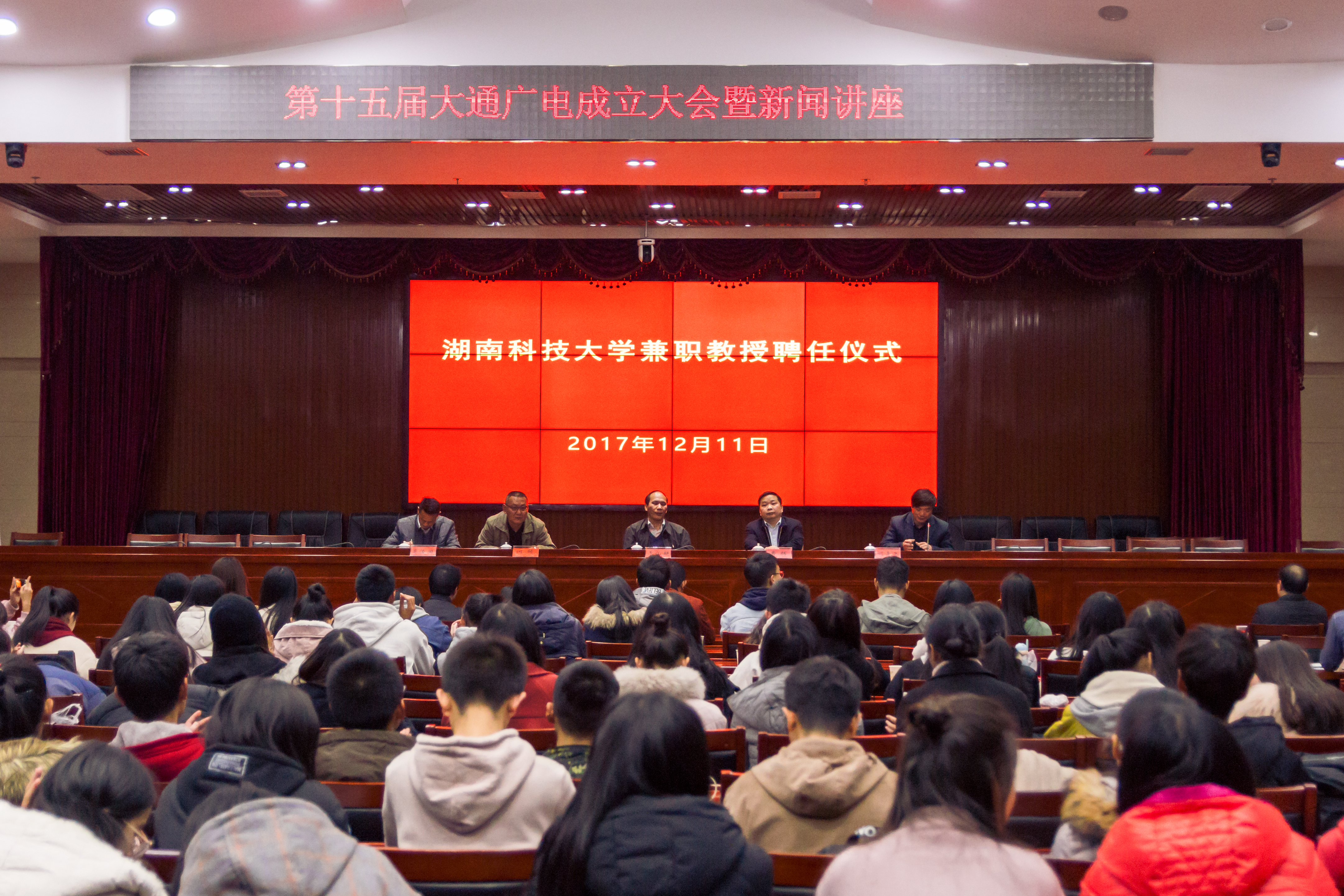 为加强我院新闻专业的理论性,推动新闻专业的快速发展,12月11日晚,于立德楼五楼报告厅,《湖南日报》湘潭分社社长曹辉受聘为我院兼职教授,校长李伯超出席聘任仪式,我院院长刘奇玉、校党委宣传部部长何频、副部长廖志鹏以及人事处副处长廖俊国参加。仪式结束后,曹辉以“我的记者之路”为题作新闻讲座。我院新闻系主任陈功主持本次讲座,大学生通讯社校广播电视台近300名校园记者以及我院17级新闻专业的全体学生到场聆听。