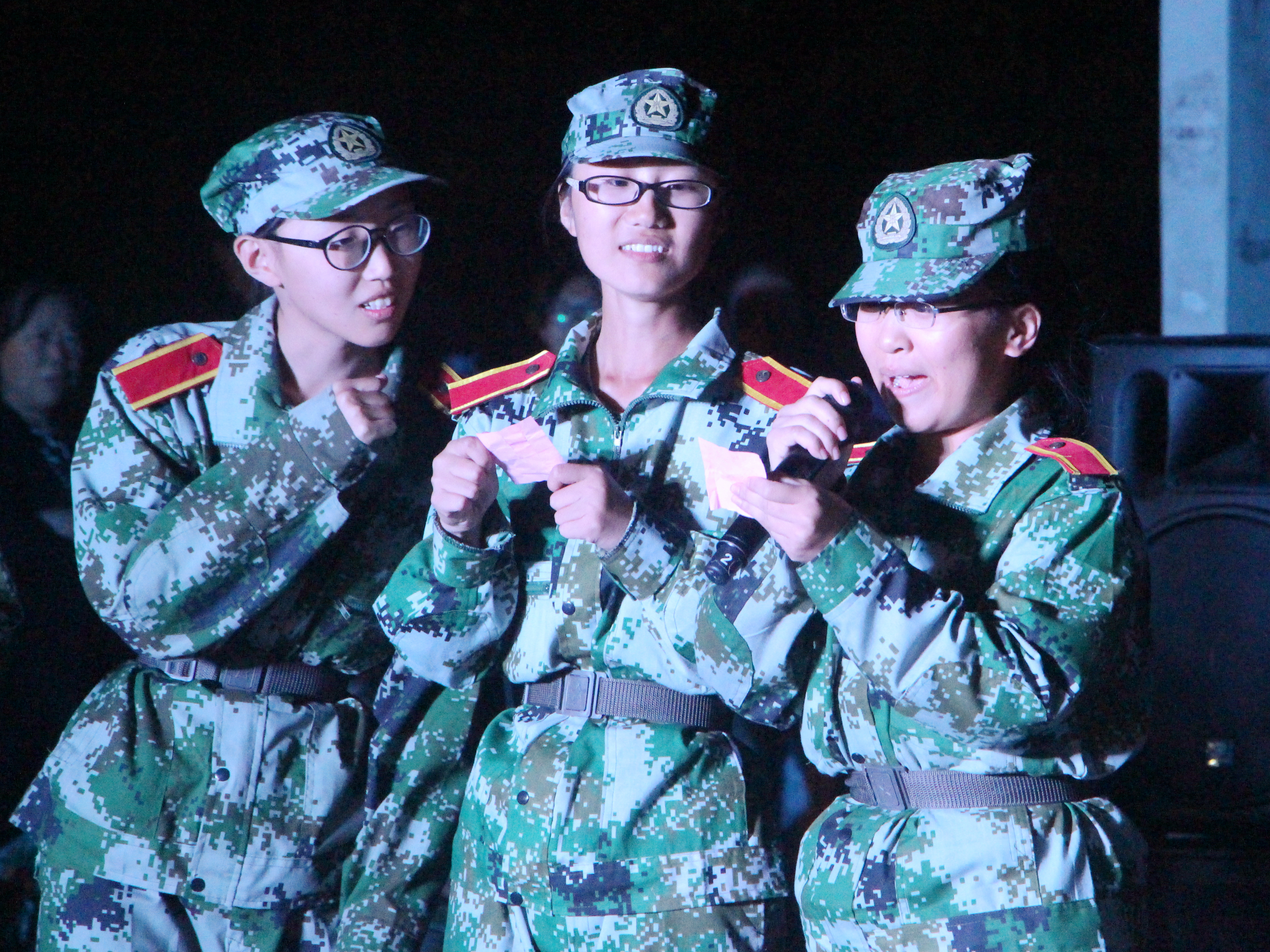 除了歌舞表演,本次慰问演出还有互动环节,“我爱你,肖教!我爱你,助班!我爱你,新闻系!”游戏环节中,新生们大声地喊出了写在纸条上的真心话。平日板着脸的教官也变得格外平易近人。“朋友,我当你一秒朋友,朋友,我当你一世朋友。奇怪,过去再不堪回首,怀缅,其实时时还有……”三排教官尹旭琰的演唱略带沙哑,打动了场下与他轻轻和着的观众。而新生们也为教官准备了他们的节目,七排一首《当你的长发拂过我的钢枪》,引得全场一齐合唱,“军训时间虽短,但是我们和教官建立了深厚的感情。”八排历史专业彭乐宜说道,“在我们心目中,胡教永远是最美的!”提及教官,他们总有诉不完的情感。