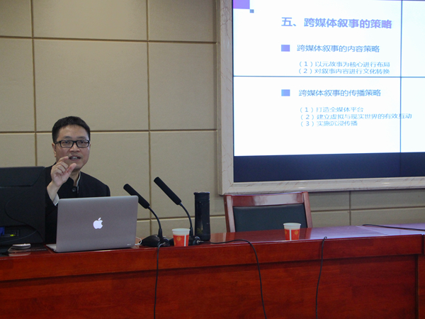 随后,彭祝斌围绕“跨媒体叙事”介绍了由来、内涵、功能、策略四个方面。其中,彭教授着重介绍了功能和策略。以《古剑奇谭》为例,从小说到电视、游戏、宣传片的推广以及发展微博中稳定的粉丝圈,都进行的不错,完美地实现了聚集用户、培育IP、吸纳资本、拓展市场的功能。在跨媒体叙事策略上,彭教授介绍了内容策略和传播策略,他以《甄嬛传》的美国化为例,说明向文化差异较大的国家地区传播文化要实现“去情境化、本质化、再情境化、再本质化”四个过程。