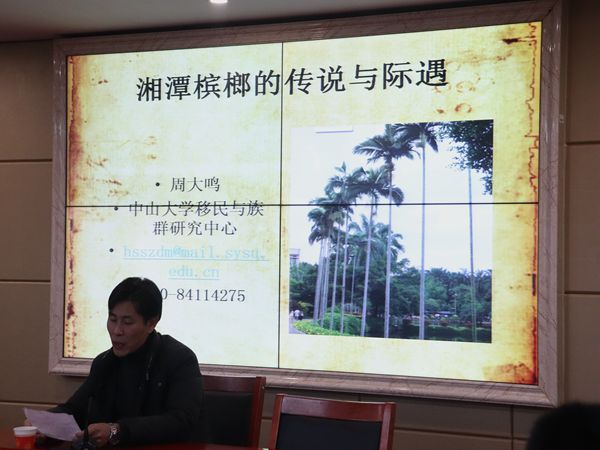 作为湘潭本地人,周大鸣教授表示槟榔是他的爱好之一。他以一张槟榔树的图片为引子,介绍了槟榔的主要产地、产量、消费市场和功用,将大家迅速带入讲座主题。周大鸣教授首先向大家展示了槟榔的研究背景:目前大多是关于的药用价值与商品价值的研究,而人文社科界对槟榔的关注则比较少。对于槟榔的食用习俗,周教授指出,在中国食槟榔的习俗可以追溯到南朝,并通过讲述东晋末年大臣刘穆之酷爱食槟榔的故事、举例苏轼诗作和竹枝词中提到槟榔的诗句等,体现出食槟榔现象在民间的普遍性。槟榔本身作为一种食品,也有着它所承载的文化涵义,如槟榔树因结果较多而有多子多福的寓意,因而在湘潭成为婚宴的必备品等。周教授说道,随着居民消费水平和槟榔在礼仪交往中实用度的提高,促使商业资本大量注入并推动槟榔消费与价格的变动,进而引发消费阶层与社会的分化,这也是槟榔的一种成长过程。