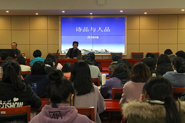 11月28日下午,浙江工业大学肖瑞峰教授应邀于立言楼B4-1会议室举办了以“诗品与人品”为主题的学术讲座。此次讲座由我院王友胜教授主持,李鸿渊、丁志丛、王奕祯、余霞、何湘等老师及17级汉语言文学专业的部分硕士研究生和本科生约120人到场学习聆听。