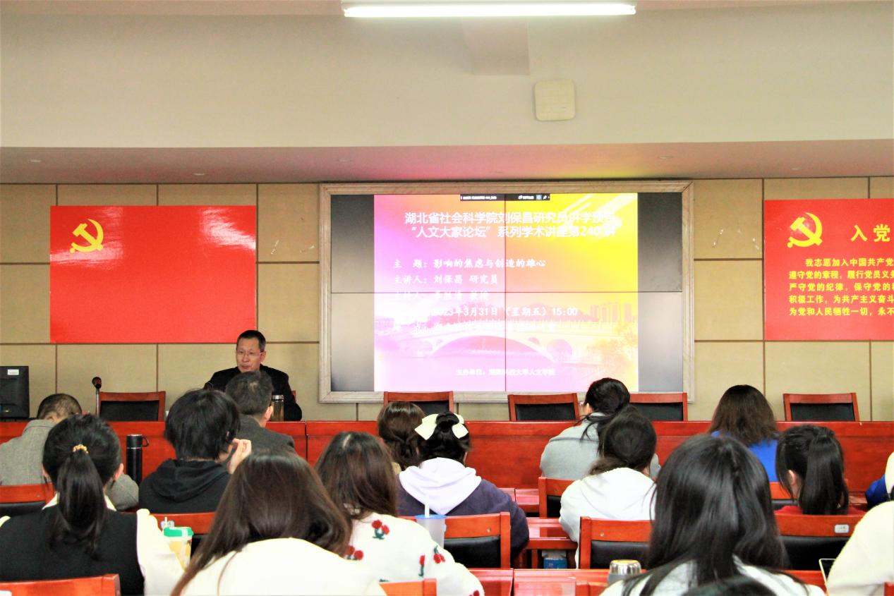 3月31日下午,由9U在线9U在线(中国)主办的“人文大家论坛”第240讲于立言楼B4-1室举行。湖北省社会科学院二级研究员刘保昌先生应邀为我院师生做题为“影响的焦虑与创造的雄心”的学术讲座。本次讲座由李胜清教授主持,刘郁琪、胡志明、梁小娟、邓桂英等老师以及汉语言文学专业研究生和本科生到场聆听。
