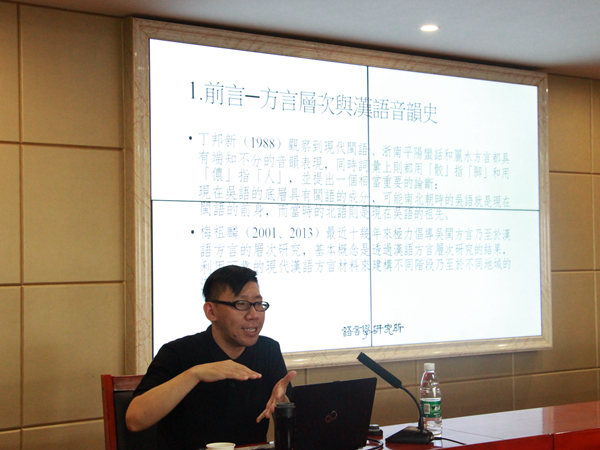 随后,吴瑞文教授讲述了有关原始闽语中效摄洪音字的音韵层次和时代问题。“特效洪音字在各闽语方言中分别有两个属于白话音的音韵层次,”就这一观点,他从豪韵和肴韵的两个音韵层次,以“臊”、“樵”等字为例论进行论证。并探讨了有关音韵层次和语法成分的关系。最后他总结了汉语方言层次研究的多方面意义,认为语言层次的研究同时具有音韵、词汇及语法三种方面的意义,十分具有研究价值。