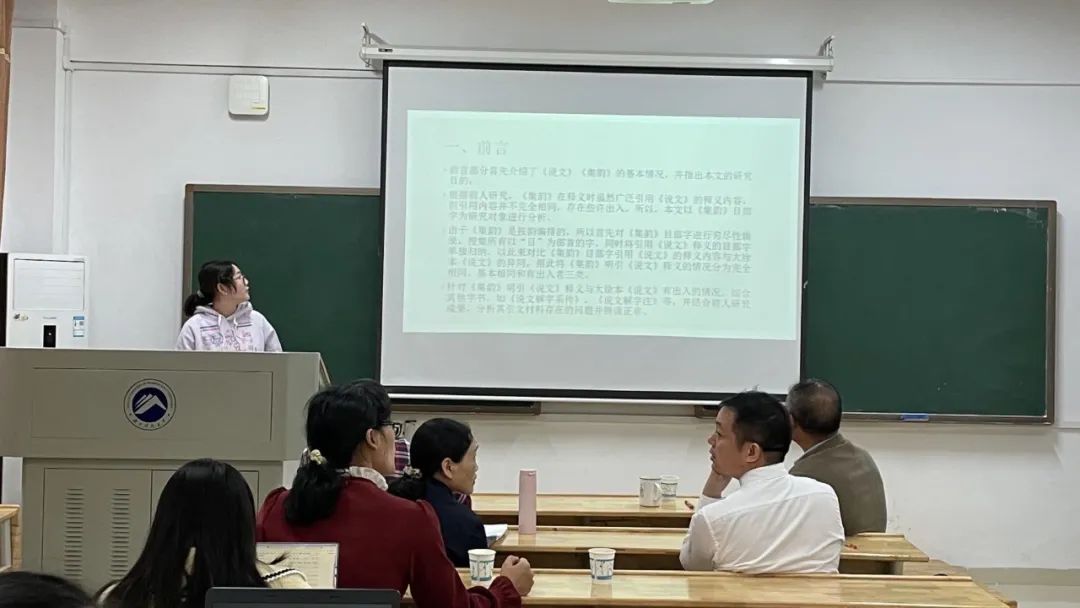 范卓的汇报主题为《<集韵>目部字引<说文>释义研究》,聂志军老师对其建议,文字出入的现象要进行鉴别取舍,重点关注异文情况。在已有前人研究的情况下如果没有突破,文章价值就会大打折扣,可以考虑换材料,更换字书进行突破。